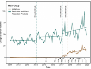 De plus, il apparaît que l’évolution de ces recherches est corrélée aux rapports internationaux médiatisés ou aux actions politiques d’initiative populaire sur le sujet, comme les rapports des Nations unies sur le glyphosate.