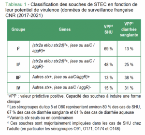 De la virulence de Escherichia coli 22/07/2025 Alix de Reynal Bacille à coloration de Gram négative, de la famille des Enterobacteriaceae, Escherichia coli (E. coli) appartient au microbiote intestinal des humains et des animaux à sang chaud. L’ANSES distingue désormais clairement les souches STEC “potentially pathogenic” des souches EHEC plus dangereuses, via une évaluation génétique précise des virulences. ANSES© La principale voie de transmission est indirecte par consommation d’aliments d’origine animale ou végétale, ou d’eaux, contaminés. Elle peut également être directe par contact avec des animaux porteurs ou des environnements contaminés par leurs déjections. La transmission de personne à personne est possible, elle est surtout décrite en milieu familial ou dans les collectivités de jeunes enfants. Le renforcement de la surveillance, les recommandations d’hygiène et les consignes de cuisson visent à prévenir l’exposition humaine, particulièrement dans les populations sensibles. Source : ANSES – Fiche de description de danger biologique transmissible par les aliments