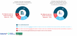 Et vous ? Comment déjeunez-vous ? 07/12/2023 Alix de Reynal La pause déjeuner incontournable en France 66 % des Français s’arrêtent pour déjeuner : un must ! 41 % considèrent que le déjeuner est le repas le plus important de la journée C’est un repas copieux (61 %), coûteux (58 %) et qualitatif (55 %) 61 % des Français prennent systématiquement un déjeuner (66 % en télétravail), tandis que 20 % sautent le repas régulièrement 19 % ne prennent pas de déjeuner systématiquement 45 % des actifs et des étudiants qui déjeunent sur leur lieu de travail, apportent leur repas, 25 % vont à la cantine, 12 % achètent un plat à l’extérieur (10 % vont au restaurant, 5 % achètent un plat au supermarché, 3 % se font livrer au bureau). 75 % s’informent sur l’actualité( ? regarde la TV, ordi, internet ?) pendant la pause, tandis que 59 % sont sur les réseaux sociaux et 55 % continuent à travailler. 24 heures dans la vie des Français – Enquête 2/3 : Les Français à la mi-journée – Les zOOms de l’Observatoire Cetelem – Novembre 2023