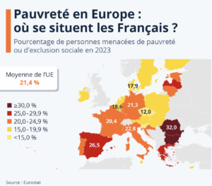 En 2023, 94,6 millions de personnes dans l’UE (soit un peu plus de 21 % de la population) étaient menacées de pauvreté ou d’exclusion sociale, c’est-à-dire qu’elles vivaient dans des ménages confrontés à au moins un des trois risques de pauvreté et d’exclusion : la pauvreté monétaire, la privation matérielle et sociale grave et/ou la vie dans un ménage à très faible intensité de travail (dont les adultes travaillent à moins de 20 % de leur potentiel sur un an).