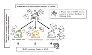 La pollution fait-elle grossir ? 03/10/2023 Alix de Reynal Une vaste expérience naturelle réalisée en Catalogne montre que déménager dans des zones où la pollution atmosphérique est plus élevée, est associé à une prise de poids chez les jeunes enfants. L’étude a inclus 46 644 enfants et adolescents (âgés de 2 à 17 ans). Ils ont déménagé une fois entre 2011 et 2018. Inscrits dans les soins de santé primaires de Catalogne, les chercheurs ont relevé leur poids et leur taille, et calculer leur IMC au départ et à 180 jours. L’analyse montre que : l’IMC augmente avec la pollution de l’air. L’effet était plus fort chez les enfants d’âge préscolaire et primaire. déménager dans des zones moins polluées n’a eu aucun effet significatif sur l’IMC. déménager dans des zones présentant des niveaux de pollution atmosphérique similaires était associé à une diminution de l’IMC. Les mécanismes biologiques qui lient la pollution de l’air à la prise de poids ne sont pas entièrement compris. Ils peuvent inclure le stress oxydatif, l’inflammation du tissu adipeux, une absorption réduite de glucose. Mais aussi, une perturbation hormonale, des modifications du métabolisme ou une fonction pulmonaire réduite. L’augmentation du trafic peut également entraîner des changements de comportement. Passer moins de temps à l’extérieur, ce qui peut entraîner une augmentation du poids. Les auteurs soulignent que même si l’ampleur des associations observées est faible, l’impact sur la santé publique mondiale pourrait être important. 56 % de la population mondiale vit dans des zones urbaines plus polluées. Changes in air pollution exposure after residential relocation and body mass index in children and adolescents: A natural experiment study – Sarah Warkentin ett al.- https://doi.org/10.1016/j.envpol.2023.122217
