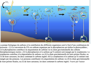 Les poissons de mer peuvent séquestrer du carbone 06/11/2025 Béatrice de Reynal L’océan, le 2e puits de carbone La vaste majorité des 38 000 milliards de tonne de carbone stocké par l’océan l’est à travers des phénomènes physiques. Mais la biomasse des océans y contribue également, à hauteur d’environ 1 300 milliards de tonnes de carbone organique. Les poissons représentent environ 30 % de ce stock de carbone. Ceci est rendu possible via leur contribution à ce qu’on appelle la pompe biologique du carbone, c’est-à-dire, la série de processus biologiques qui permettent de transporter le carbone des eaux de surface vers les fonds marins. C’est un élément majeur du cycle du carbone. Schéma de l’auteur Cette pompe biologique commence par le phytoplancton, capable de transformer du CO2 en matière organique carbonée. À sa mort, une partie de ce carbone va couler dans les profondeurs de l’océan où il sera séquestré durablement, tandis que le reste sera ingéré par des prédateurs. À nouveau, c’est lorsque ce carbone va couler dans les profondeurs (pelotes fécales, carcasses des prédateurs morts…) qu’il sera durablement séquestré. Les poissons qui coulent Les poissons jouent un rôle clé dans ce processus : leurs carcasses et pelotes fécales, plus denses, coulent bien plus rapidement que celles du plancton. Or, plus le carbone coule rapidement vers les profondeurs – et s’éloigne de l’atmosphère –, plus le temps qu’il mettra avant de retourner à l’atmosphère sera important : le carbone sera ainsi stocké de façon plus durable. La pompe biologique du carbone et la contribution des différents organismes sont le fruit d’une combinaison de processus. 1) La conversion du CO₂ en carbone organique par le phytoplancton qui réalise la photosynthèse ; 2) le phytoplancton contribue à la séquestration de carbone via la chute gravitationnelle des cellules phytoplanctoniques mortes ; 3) le phytoplancton et le carbone qu’il contient sont mangés par le zooplancton. Le zooplancton contribue à la séquestration de carbone via 4) la chute gravitationnelle de leurs pelotes fécales, ou 5) de leurs carcasses, les deux contenant le carbone ingéré. 6) Le zooplancton et le carbone qu’il contient sont mangés par des poissons. Les poissons contribuent à la séquestration de carbone via (4) la chute gravitationnelle de leurs pelotes fécales, ou (5) de leurs carcasses, les deux contenant le carbone ingéré. Les gros poissons n’ont que l’homme comme prédateur ? Notre étude, qui s’est spécifiquement intéressée aux espèces de poissons d’intérêt commercial (c’est-à-dire ciblées par la pêche), estime que ces derniers étaient en mesure de séquestrer 0,23 milliard de tonnes de carbone par an en 1950 (soit 0,85 tonne de CO2 par an). Merci à The Conversation pour cette révélation et la démonstration scientifiques de ce pénomène. https://theconversation.com/oceans-les-poissons-un-puits-de-carbone-invisible-menace-par-la-peche-et-le-changement-climatique-268408?utm_medium=email&utm_campaign=La%20lettre%20de%20The%20Conversation%20France%20du%2030%20octobre%202025&utm_content=La%20lettre%20de%20The%20Conversation%20France%20du%2030%20octobre%202025+CID_36a23a443df1042fac830940518a412b&utm_source=campaign_monitor_fr&utm_term=Ocans%20%20les%20poissons%20un%20puits%20de%20carbone%20invisible%20menac%20par%20la%20pche%20et%20le%20changement%20climatique
