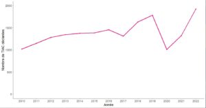 Les toxi-infections alimentaires collectives (TIAC) en France en 2022 22/05/2024 Alix de Reynal Les maladies infectieuses d’origine alimentaire, comme les toxi-infections alimentaires collectives (TIAC), représentent un risque sanitaire pour la population. Elles sont souvent causées par la consommation d’aliments contaminés par des bactéries pathogènes. 2022 est le niveau le plus élevé de contamination depuis la mise en place du système de surveillance en 1987. La tendance avant covid était déjà à la hausse. Nombre de TIAC déclarées en France aux ARS et/ou aux DD(CS)PP entre 2010 et 2022 Ainsi, en 2022, 1 924 TIAC ont été déclarées en France, touchant 16 763 personnes, avec 643 hospitalisations et 17 décès. En cause, la Salmonella était l’agent le plus fréquent (42 % des cas confirmés), Bacillus cereus, Staphylococcus aureus et Clostridium perfringens (73 %). 15 % des TIAC sont d’origine inconnue. 39 % des TIAC à Salmonella étaient associées à la consommation d’œufs. Les TIAC à Clostridium perfringens, Bacillus cereus et Staphylococcus aureus étaient liées à la consommation de plats composés ou cuisinés. La consommation de coquillages était suspectée dans 39 % des TIAC virales confirmées ou suspectées. On remarque une diminution des TIAC familiales (de 33 % à 25 %), en revanche, une augmentation dans les restaurants commerciaux (de 35 % à 45 %) entre 2021 et 2022. Ainsi, en 2022, 591 mesures correctives ont été prises, incluant des actions comme l’information/formation du personnel et la désinfection des établissements. Distribution du nombre de TIAC déclarées aux ARS et/ou aux DD(CS)PP pour 100 000 habitants par région – France, 2022 https://www.santepubliquefrance.fr/les-actualites/2024/pres-de-2-000-toxi-infections-alimentaires-collectives-declarees-en-france-en-2022