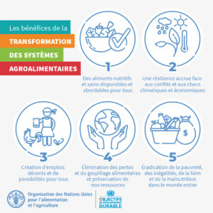 L’ONU appelle à transformer notre façon de produire et de consommer 06/09/2023 Alix de Reynal Selon les estimations de l’ONU : plus de 780 millions de personnes souffrent de la faim, près d’un tiers de la nourriture produite dans le monde est perdue ou gaspillée près de trois milliards de personnes n’ont pas les moyens d’avoir une alimentation saine La fin récente de l’Initiative céréalière de la mer Noire par la Russie va encore aggraver la situation. Et ce sont les plus pauvres et les plus fragiles qui seront les premières victimes. C’est pourquoi Antonio Guterres, secrétaire général de l’ONU, propose de mettre en place des systèmes agroalimentaires efficaces, inclusifs, résilients & durables pour assurer l’avenir de notre planète. Cela se traduit par des investissements massifs dans des systèmes alimentaires durables. Et cela suppose de faire passer l’humain avant le profit. Il faut donc explorer de nouveaux moyens d’accroître la disponibilité d’aliments frais et sains pour tous les individus, de maintenir les marchés alimentaires ouverts et de supprimer les barrières commerciales et les restrictions à l’exportation. https://news.un.org/fr/story/2023/07/1137082?