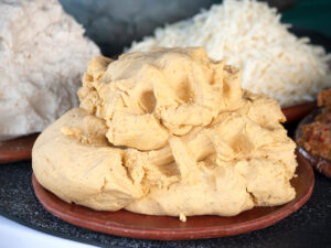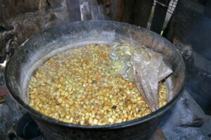 Nixtamal : vous connaissez ? …. ça se mange ! 16/07/2024 Béatrice de Reynal La nixtamalisation est un procédé culinaire d’Amérique centrale très ancien qui sert à traiter les grains de maïs afin d’améliorer leur contenu nutritionnel. En effet, le tégument du grain ou péricarpe est très dur et cireux, impossible à croquer et difficile à cuire. En faisant tremper les grains dans l’eau, on ne parvient pas à bout de lui. Alors les traditions locales ont trouvé on ne sait comment qu’en ajoutant à l’eau de cuisson un peu de cendres de bois, le péricarpe – cette enveloppe transparente, était attendrie et laissait d’ouvrir son coeur. Peu à peu, les populations ont utilisé du lait de chaux pour le même effet. Scientifiquement, on cherche à augmenter le pH pour avoir une solution alcaline : c’est la naxtamilisation. Ce procédé a des plusieurs avantages nutritionnels ; on peut enlever le péricarpe, permettre à l’eau de bien imbiber le grain, ce qui permet de commencer à gélatiniser les grains d’amidon et permettre une cuisson de meilleure qualité. En plus d’avoir un amidon mieux assimilable, ce procédé augmente la biodisponibilité de la vitamine PP ou niacine – PP pour « prevent pellagre » une carence qui était alors fréquente. Ce pH favorable permet aussi de contrôler la contamination bactérienne durant le trempage Le maïs ainsi traité est nommé nixtamal, d’où le nom du procédé. L’eau de chaux donne une saveur particulière. Une fois broyé, la pâte obtenue est du nixtamal ou du masa : . Masa de Nixtamal Ce n’est pas la première fois que l’humain découvre une façon de mieux exploiter une denrée alimentaire avec des adjuvants non alimentaires. On verra dans les Caraïbes, comment ils apprirent à rendre comestible le manioc qui, cru, est un poison.