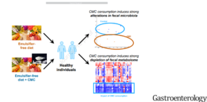 Un émulsifiant perturbe le microbiote 20/12/2021 Béatrice de Reynal Nous vous l’avions déjà indiqué il y a quelques mois. D’après une toute récente étude de l’Inserm publiée dans la revue Gastroenterology, un additif alimentaire émulsifiant ou épaississant, la carboxyméthycellulose (CMC), perturbe l’équilibre du microbiote dans l’intestin humain. Pendant 10 jours, 7 personnes sans problème intestinal connu ont consommé 15 g de CMC. La composition de leur microbiote a été comparée à celle de 9 patients ayant reçu un placebo pendant cette même période. Et les résultats sont sans appel : les patients ayant consommé de la CMC ont vu leur équilibre microbien intestinal nettement perturbé, ainsi que celui de l’ensemble des molécules qui participent au bon fonctionnement de l’organisme. Parmi les changements, une réduction des acides gras à chaine courte et des acides aminés libres. Chez deux sujets, les chercheurs ont même observé un empiètement accru du microbiote sur la couche de mucus interne normalement stérile, une caractéristique centrale de l’inflammation intestinale, ainsi que des altérations importantes de la composition du microbiote. D’après les chercheurs, ces résultats montrent que l’emploi fréquent de CMC dans les aliments transformés ont de grandes chances (si on peut dire ça comme ça …) de contribuer au développement de maladies chroniques inflammatoires, comme c’est le cas de la maladie de Crohn ou du syndrome de l’intestin irritable. Toutefois, ces résultats sont à prendre avec du recul car l’étude a été menée sur un nombre restreint de personnes, auxquelles on a administré des doses conséquentes de CMC, pas forcément représentatives de ce qui est assimilé au quotidien par les consommateurs. L’étude ne conclut pas directement sur des conséquences pour la santé mais nul doute que les recherches à ce sujet vont se poursuivre pour bien comprendre les effets de cet additif sur l’Homme. Source : Chassaing, Benoit & Compher, Charlene & Bonhomme, Brittaney & Liu, Qing & Tian, Yuan & Walters, William & Nessel, Lisa & Delaroque, Clara & Hao, Fuhua & Gershuni, Victoria & Chau, Lillian & Ni, Josephine & Bewtra, Meenakshi & Albenberg, Lindsey& Bretin, Alexis & Mckeever, Liam & Ley, Ruth & Patterson, Andrew & Wu, Gary & Lewis, James. (2021). Randomized controlled-feeding study of dietary emulsifier carboxymethylcellulose reveals detrimental impacts on the gut microbiota and metabolome. Gastroenterology. 10.1053/j.gastro.2021.11.006. Merci à Constance Goujard, ingénieur, NutriMarketing