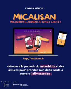 Une exposition numérique pour découvrir le rôle du microbiote 14/03/2023 Alix de Reynal L’exposition numérique « MicAliSan » a été conçue par l’INSERM et ses partenaires (Inrae, Ifremer, Oniris, Nantes Université, CRNH Ouest) : Microbiote, Alimentation et Santé ». Elle raconte l’histoire de la rencontre entre une pomme et une bactérie du microbiote intestinal. Les aliments que nous mangeons, sont transformés dans notre intestin en nutriments énergétiques, et font fonctionner notre corps. Près de mille milliards d’ouvriers microscopiques vivent dans notre intestin et participent à notre santé. Les bactéries, champignons, archées et virus forment ce qu’on appelle le « microbiote ». Ensemble, aliments et microbiote permettent à notre organisme de se développer et de fonctionner au quotidien. Mais, la perturbation de cet équilibre provoque l’augmentation de certaines maladies comme l’obésité, les maladies inflammatoires intestinales, les allergies, le cancer mais aussi des maladies neurologiques (Maladies de Parkinson ou d’Alzheimer) ou psychiatriques (troubles du spectre autistique, dépression, …). Cette exposition vous permet de découvrir le pouvoir du microbiote et donne des astuces pour prendre soin de votre santé à travers l’alimentation. https://www.micalisan.fr/